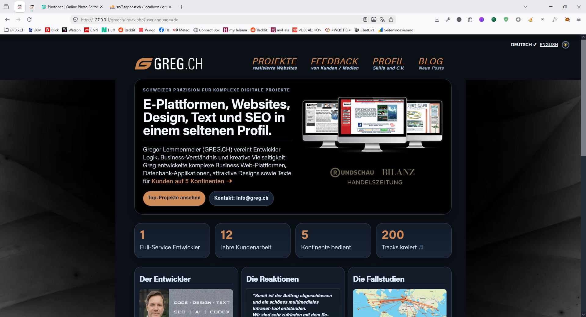 For Version 10, I created an informative website without much fuss: the website gets straight to the point right on the homepage, showing several websites I developed, customer feedback, client locations (world map), and skills – everything at a glance!