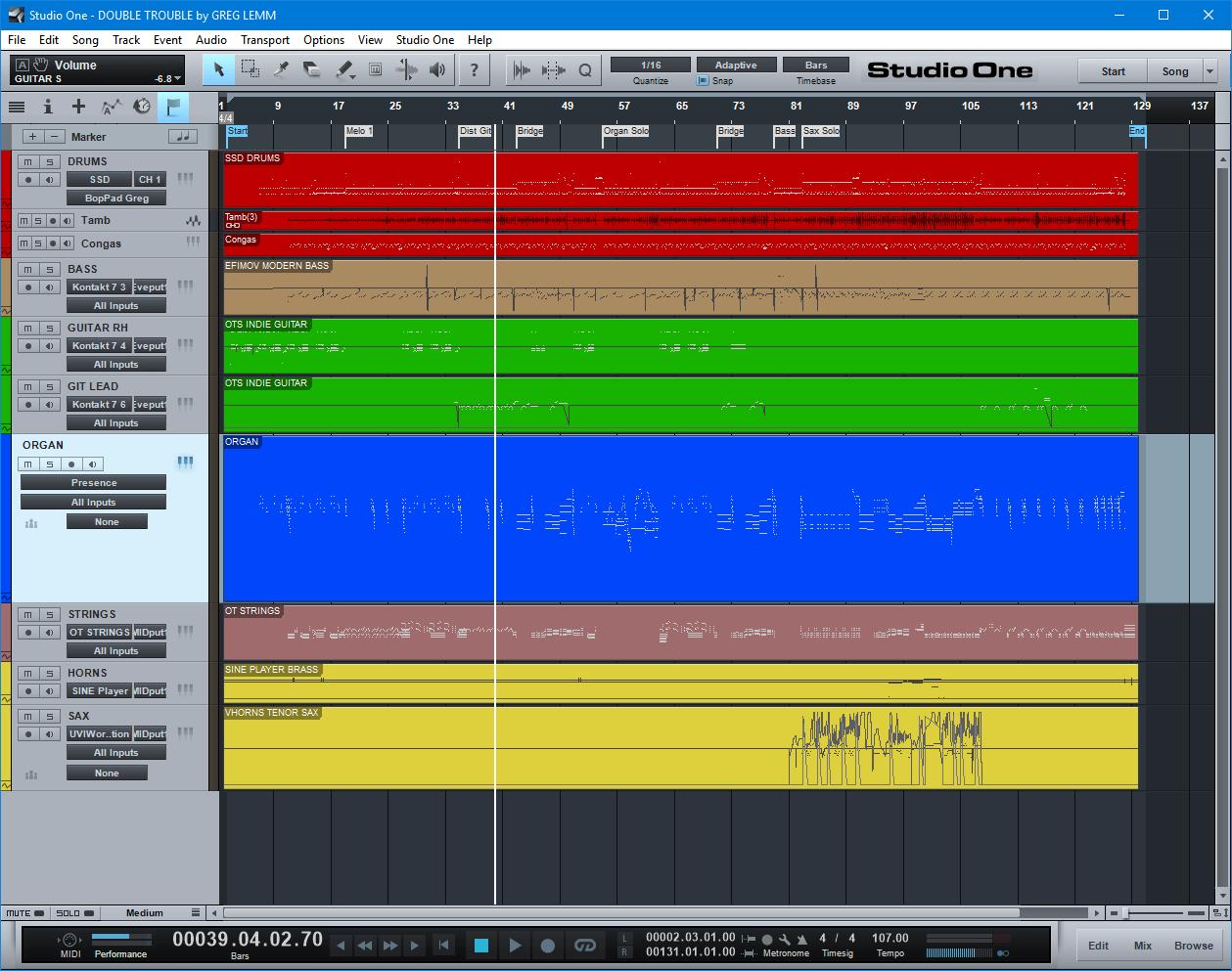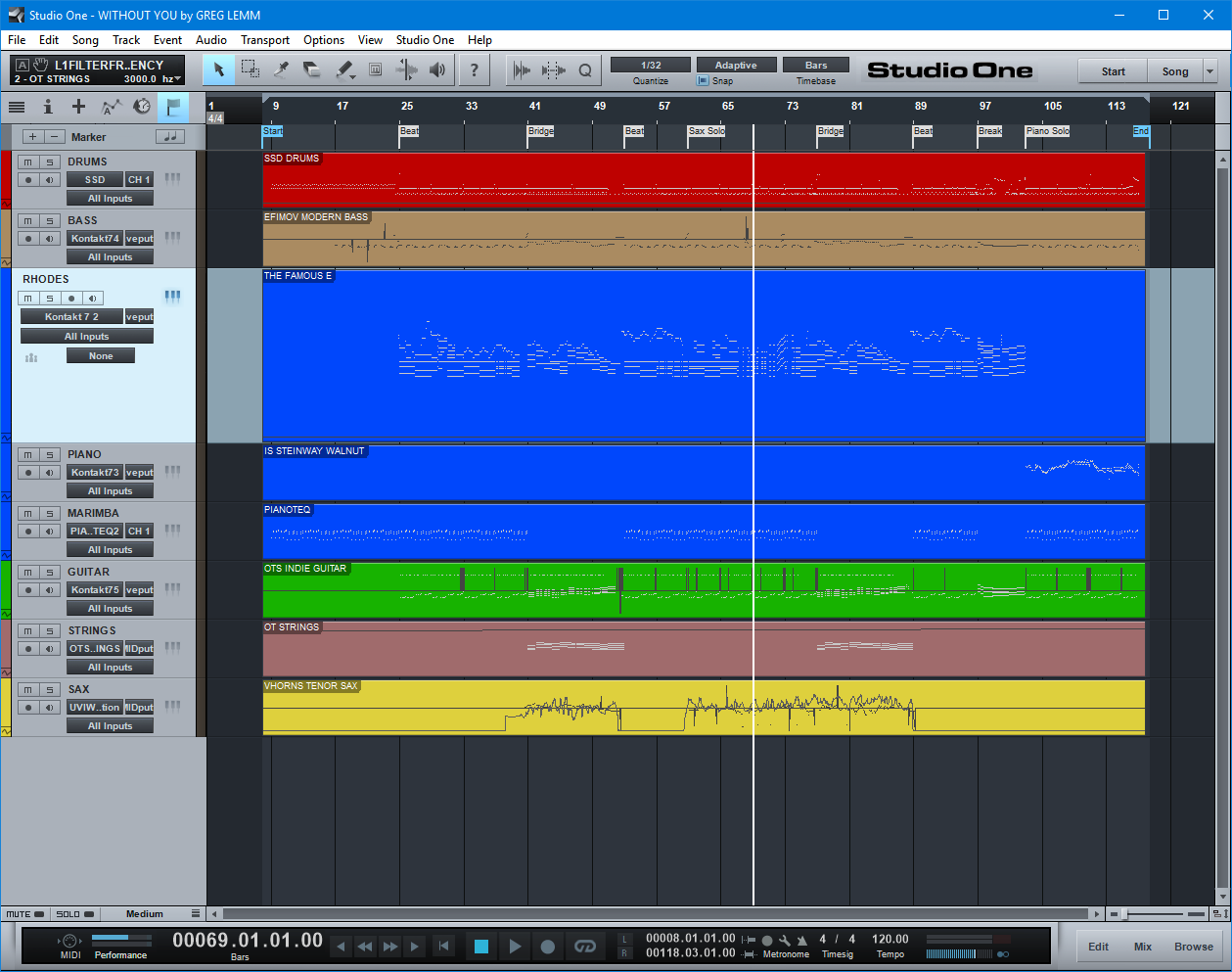 Drums, bass, keyboard, guitar and saxophone VIs (