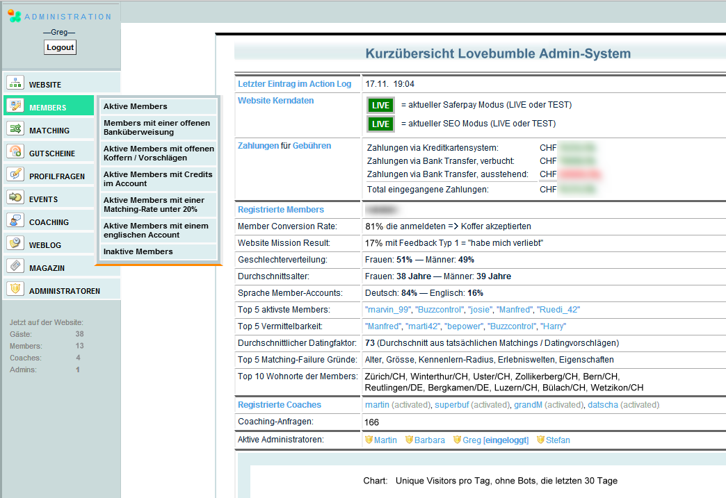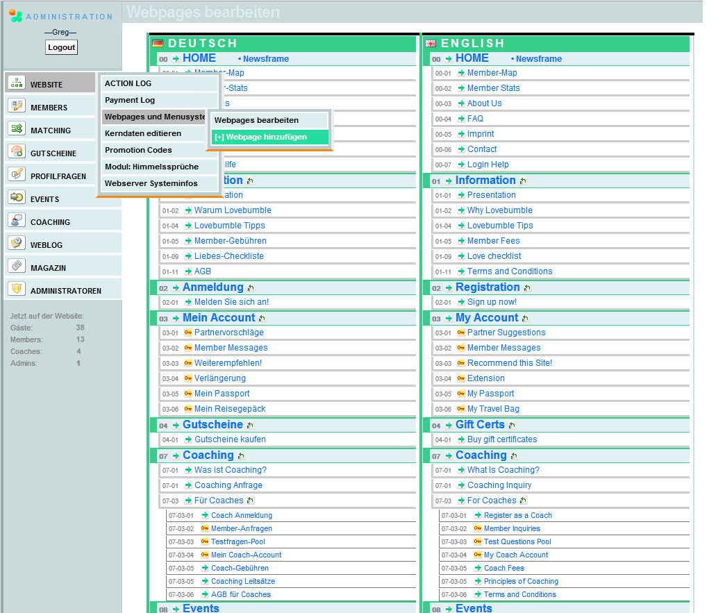 Unten im Menu steht auch die aktuelle "Who's online" Liste, geordnet nach Visitors / Members / Coaches / Admins, so dass der Admin auch während des Bearbeitens sieht, was "draussen in der Website" vorgeht.