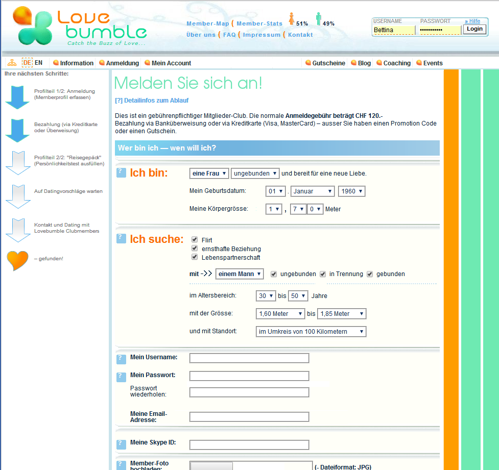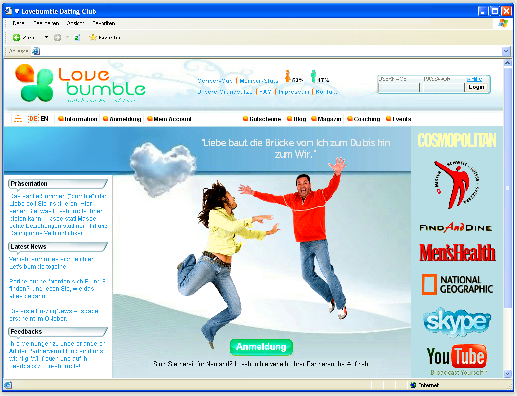 Bei Dating-Sites gilt das erfahrungsbedingte Prinzip: Je mehr Frauen mitmachen, desto mehr Männer melden sich an. Im schlimmsten Fall besteht die Memberbasis weit überwiegend aus Männern. Dann würde jedoch der Matching-Generator zu wenig Datingvorschläge generieren können. Um dem entgegenzuwirken, wurde gemäss Konzeption eine Website entwickelt, die in der Gestaltung möglichst alle "männlichen" Komponenten und Signale vermeidet, frisch und freundlich wirkt, und in der textlichen Tonalität offen und informativ ist. Also nicht "in the face" und billige Effekthascherei, sondern vertrauenerweckend.